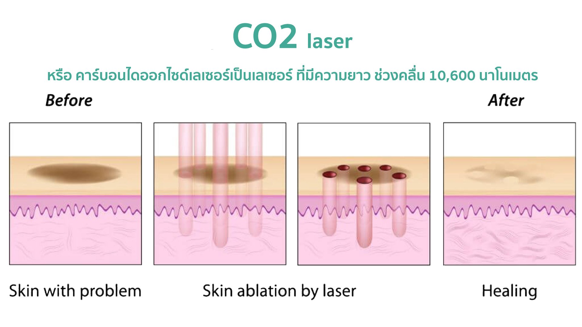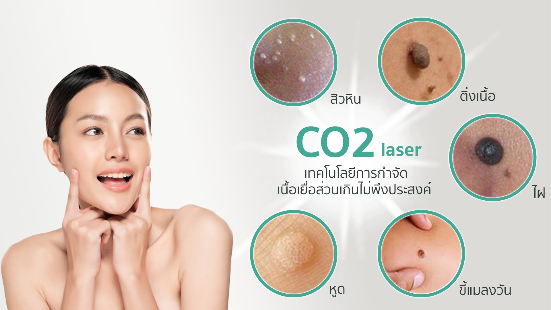 CO2 laser หรือ คาร์บอนไดออกไซด์เลเซอร์เป็นเลเซอร์ ที่มีความยาว ช่วงคลื่น 10,600 นาโนเมตร โดยเลเซอร์ จะไปเผาไหม้ ทำลายเนื้อเยื่อ ในทางแพทย์ผิวหนัง มักนำมาใช้ สำหรับ กำจัดไฝ ขี้แมลงวัน กระเนื้อ ติ่งเนื้อ หูด สิวหิน หรือรอยโรคอื่น ๆ บนผิวหนัง มีความละเอียด ในการทำงาน สูงมาก จึงสามารถ เลือกทำลาย เฉพาะ เนื้อเยื่อที่ต้องการ โดยไม่สร้างความเสียหาย ให้ กับเนื้อเยื่อโดยรอบ ไม่มีเลือดออก และ ไม่จำเป็น ต้องเย็บแผล และไม่ทำให้เกิดแผลเป็น ซึ่งต่างจาก การผ่าตัดด้วยมีด ที่จะมีเลือดออก และ สร้างความเสียหาย แก่เนื้อเยื่อรอบข้าง ซึ่งอาจจะทำให้เกิดแผลเป็นได้
